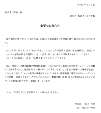 新型コロナウィルス感染症が終息不透明な状況のため、利用者の皆様、ご家族及び職員の安全を考慮した結果、年内の家族連絡会はすべて中止とさせていただきます。