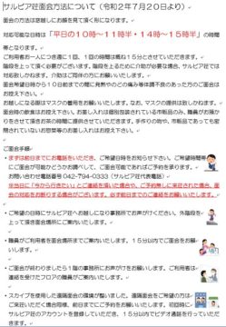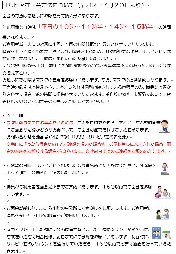 新型コロナウイルス感染症流行の影響により、直接顔を合わせた面会の制限を実施中です。 現在は窓越しに顔を見ていただく面会となります。 対応可能な日時は平日の10時~11時半及び14時~15時半となります。 面会の際は事前のご予約が必要です。 面会方法についてをご覧いただき、事前のご連絡をお願いいたします。