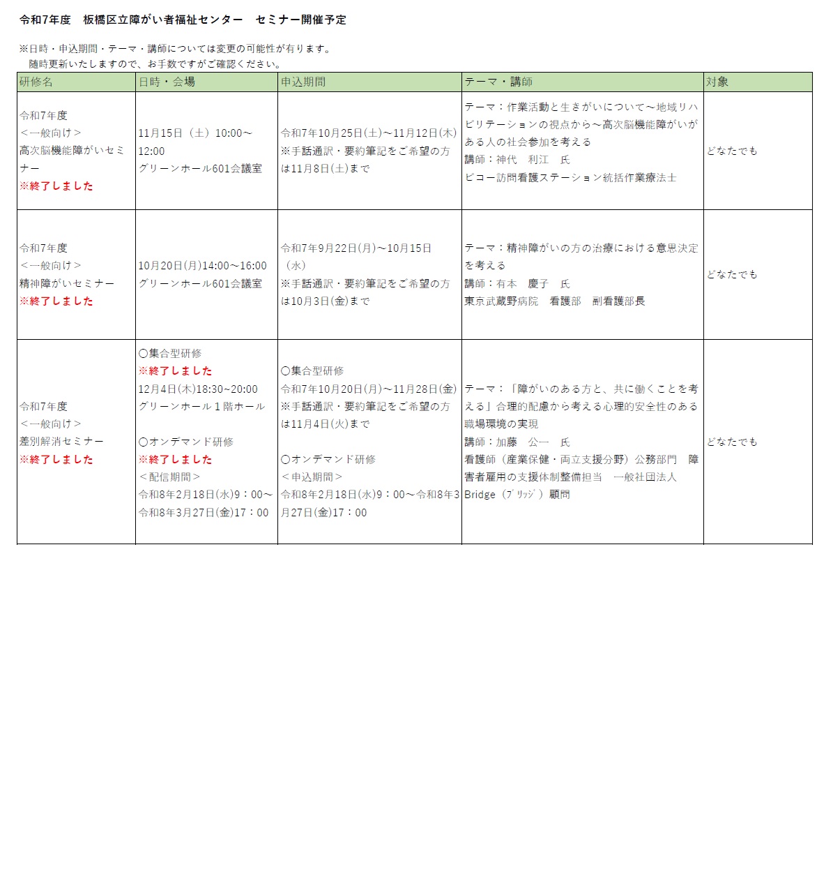 令和7年度は下記のセミナーを予定しております。詳細が決まり次第随時更新していきます。申し込み期間になりましたら、イベント予定よりお申込みください。多くの方のご参加をお待ちしております。