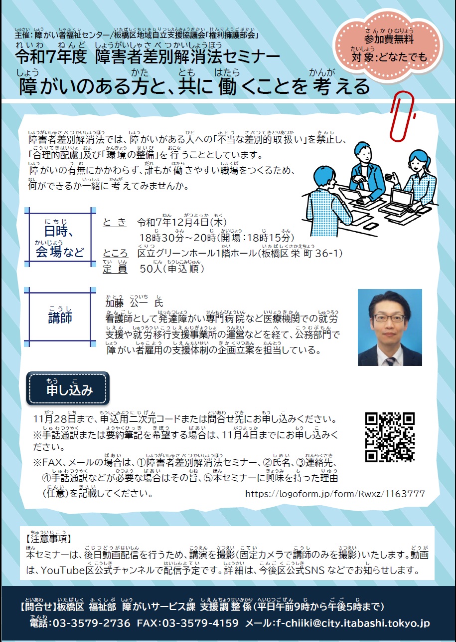 板橋区に在住・在勤のみなさまを対象に、「障害者差別解消法セミナー」を行います。 障害者差別解消法では、障がいのある人への不当な差別的取扱いを禁止し、「合理的配慮」及び「環境の整備」を行うこととしています。 今年度は『障がいのある方と、共に働くことを考える』をテーマに就労支援や就労移行支援事業所の運営などを経て、障がい者雇用の支援体制を企画立案されている看護師の加藤公一氏を講師にお招きし、セミナーを […]