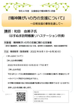 在宅生活を支えるヘルパーの方中心のお話になっておりますが、精神障がいの方の関りとしては通所先の支援員の方やサービスを導入する段階で関わる相談支援専門員の方も学べる内容です。是非ご参加下さい。