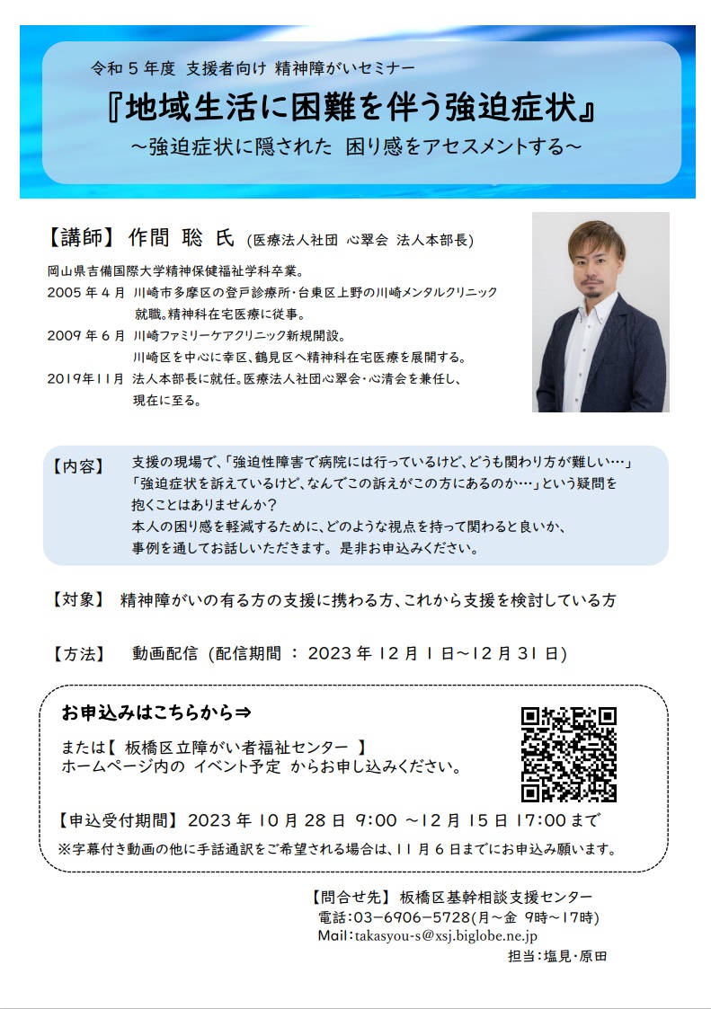 強迫症状に対する本人の困り感を軽減するために、どのような視点を持って関わっていくと良いか、ヒントを貰える内容となっております。是非ご参加下さい。