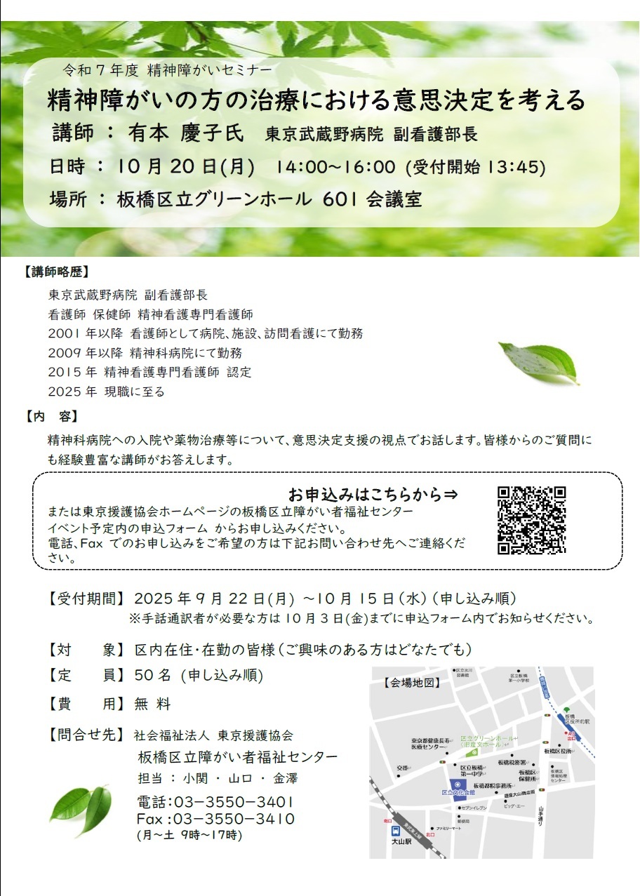 幅広い方々に精神障がいについて知っていただきたく、板橋区在住・在勤の皆様に板橋区立障がい者福祉センター主催により、精神障がいに焦点を当てたセミナーを開催いたします。