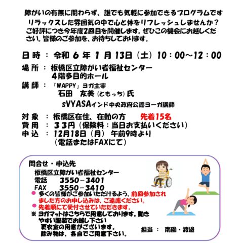 幅広い方々に精神障がいについて知って頂きたく、板橋区内在住・在勤の当事者及びご家族・支援者・関係者向けに、板橋区立障がい者福祉センター主催にて、精神障がいに焦点をあてたセミナーとなります。 今年度のテーマは「うつ病~いちからわかるうつ病との付き合い方~」となっており、ゆうりんクリニック 精神科医 森川 すいめい先生を講師にお迎えしております。 うつ病について先生から分かりやすくお話して頂き、うつ病 […]