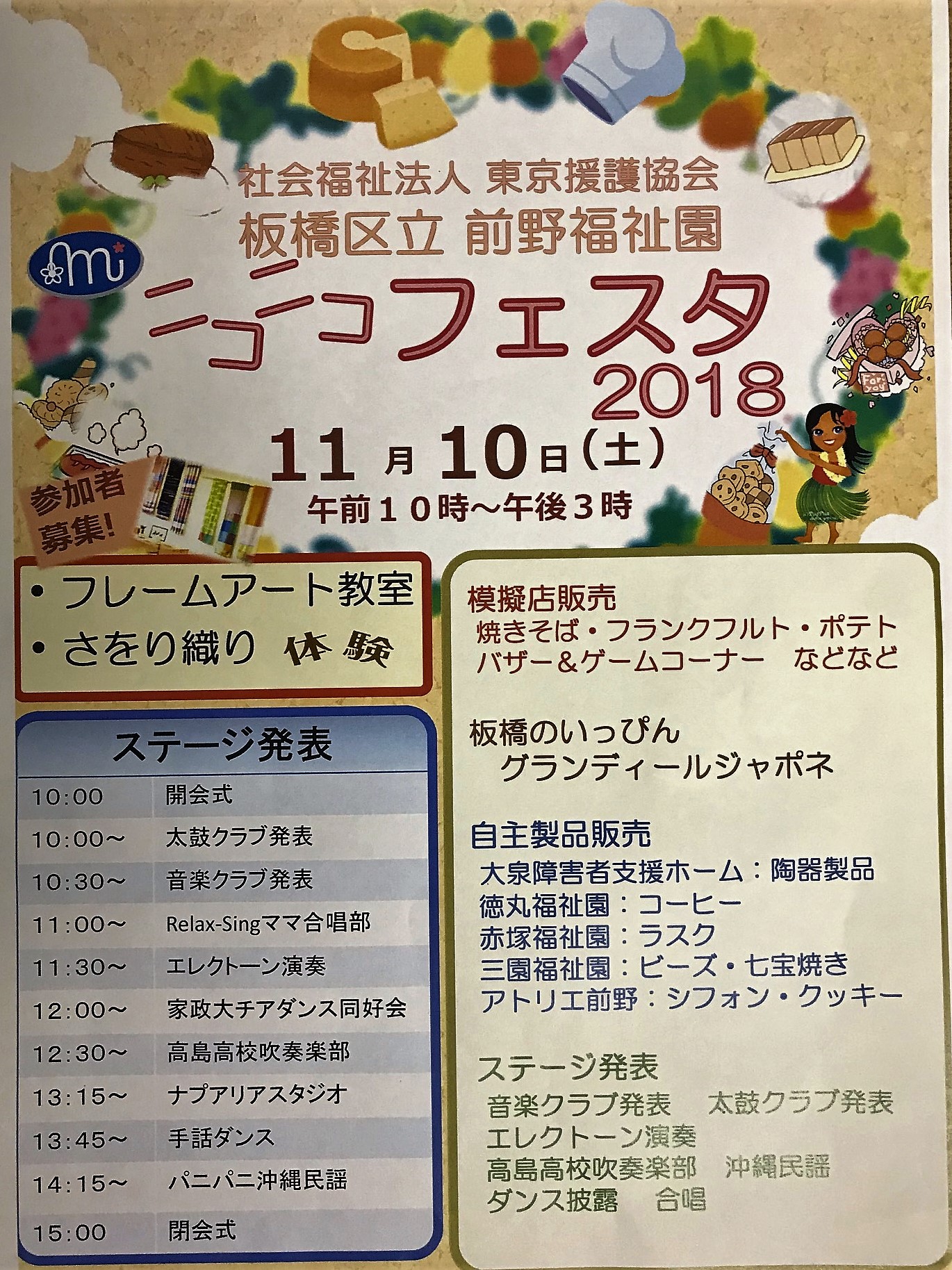 ステージ~当園の太鼓クラブと音楽クラブの発表を皮切りに、Relax-Singママの皆さんによる合唱、エレクトーンの演奏、東京家政大学チアダンス同好会の皆さんのステージ、都立高島高等学校吹奏楽部の皆さんの演奏、ナプアリアフラスタジオの皆さんのフラダンス、手話ダンスの披露、パニパニの皆さんによる沖縄民謡の演奏を行います。