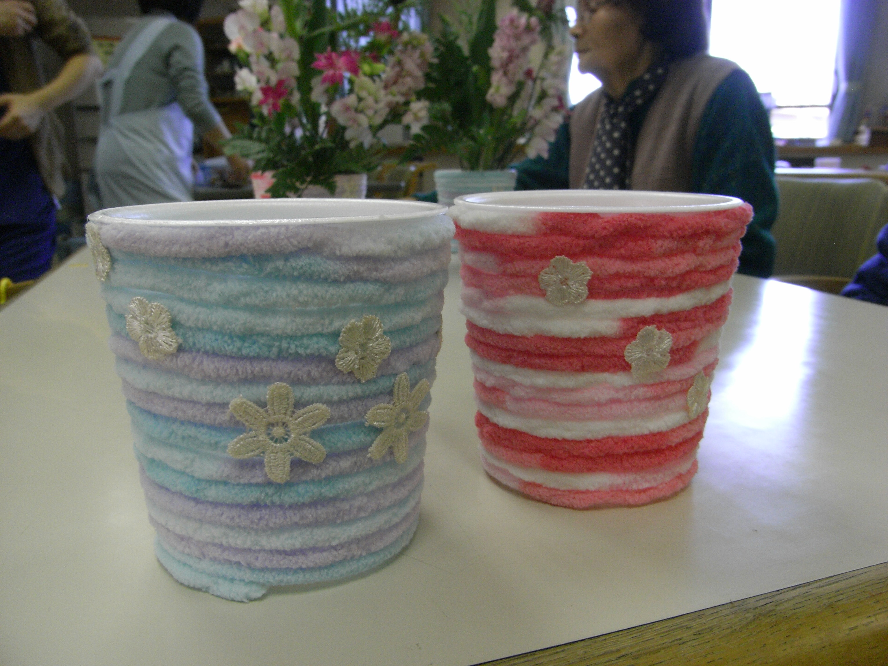 季節のきれいな花を手作りの容器にいけました。 皆さんワイワイ、ガヤガヤと楽しくお話ししながら完成しました。 できた作品をみて皆さん「にっこり」。 「玄関に飾るわ」「自分の部屋に飾ろう」とそれぞれ楽しく考えられていました。