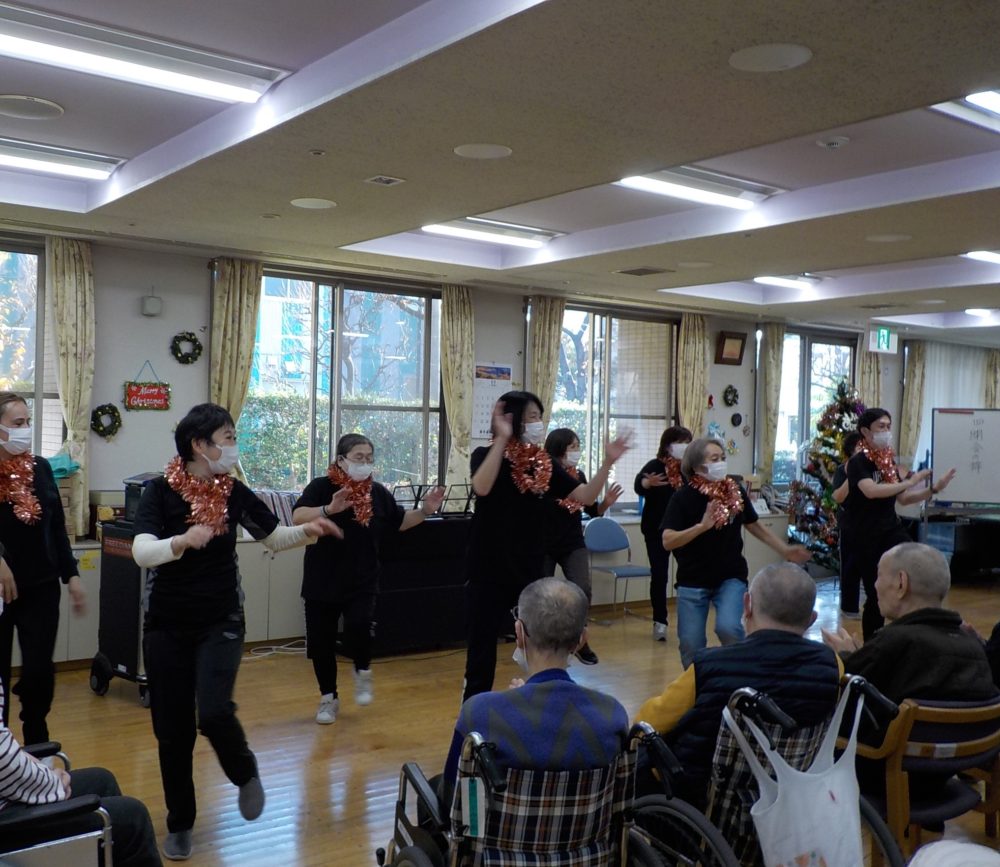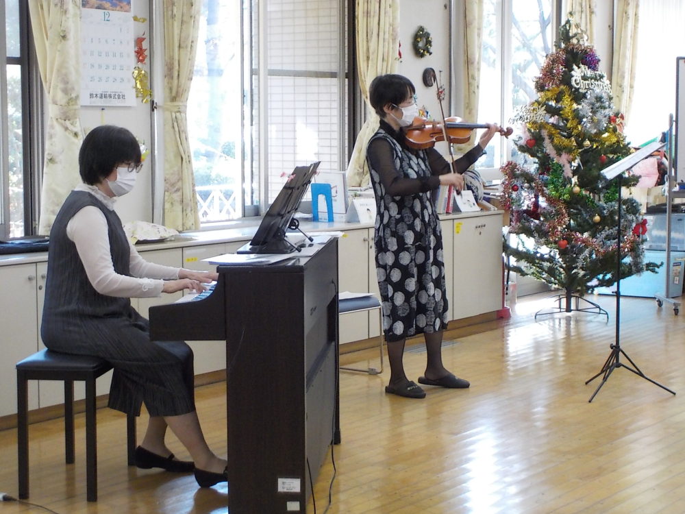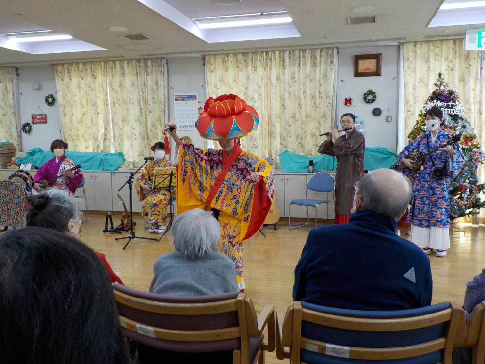 いずみの苑通所介護事業所では、12月13・14日に年忘れ会を行いました。久しぶりに、ボランティアの方々の演奏など楽しむことができました。13日は、「なんくるないさぁ」様の沖縄民謡。ちょっとした旅気分で、沖縄民謡を楽しみました。14日は「ムズィーク・カペレ」様によるバイオリンとピアノ演奏でした。懐かしい曲にゆったりとした時間が流れました。また、「東京ブギウギ」の曲に合わせた、職員の踊りも披露させていただきました。利用者様は、笑顔満載の二日間でした。