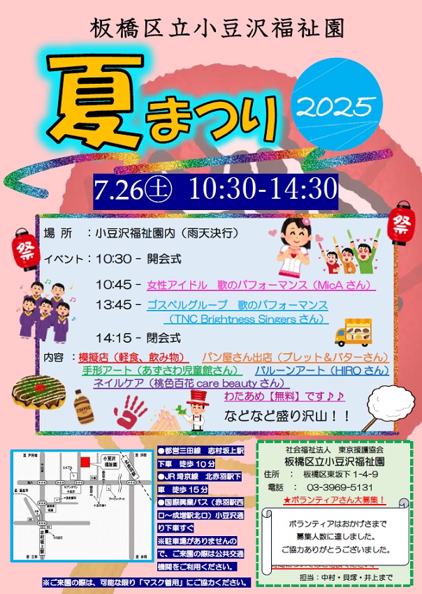 夏まつりやります! 日時 2025年7月26日 場所 小豆沢福祉園 タイムスケジュール(イベント) 10時30分 開会 10時45分 歌のパフォーマンス MicAさん 13時45分 歌のパフォーマンス TNC Brightness Singersさん 14時15分 閉会 模擬店(軽食・飲み物) 射的 → 無料! わたあめ → 無料! (数に限りがありますので 無くなったらごめんなさい) その他 パ […]