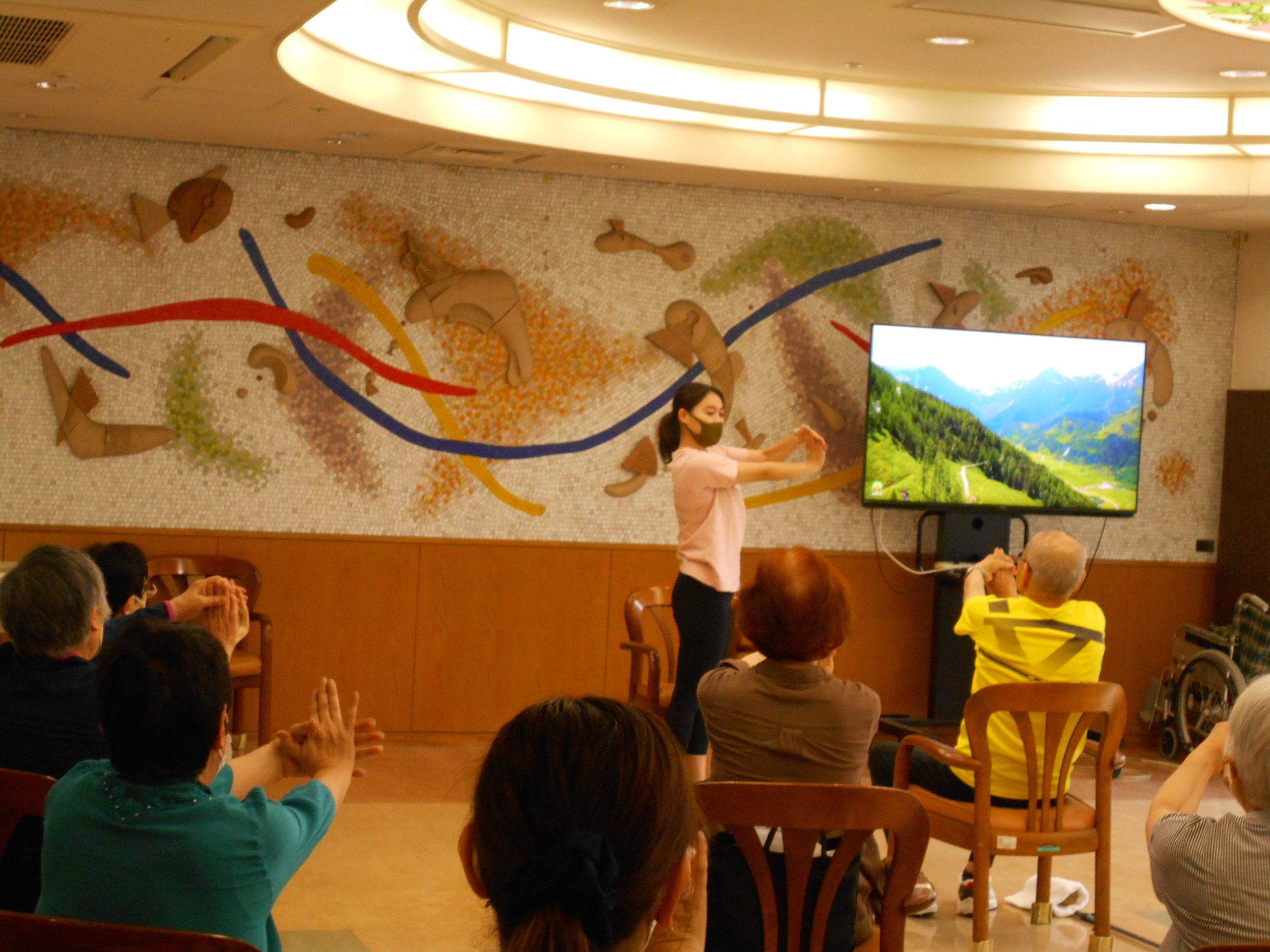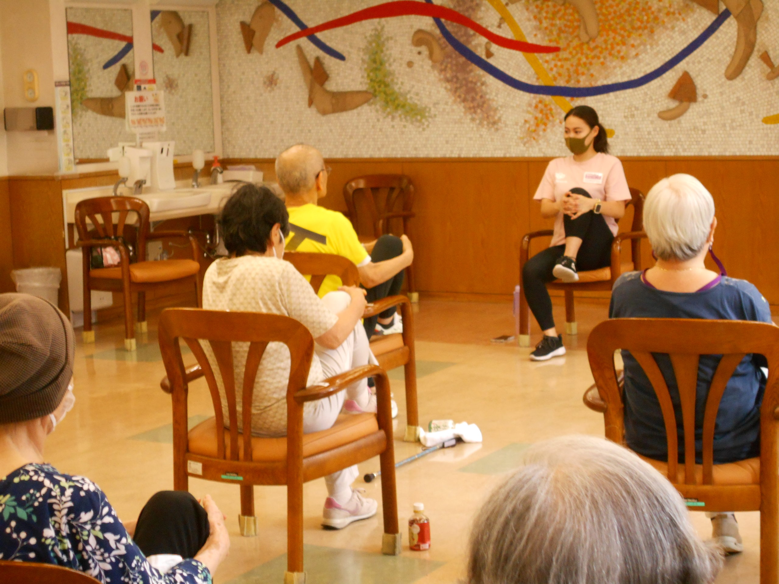 地域の高齢者や入居者が集まり、硬くなった身体をほぐし、大好評でした。