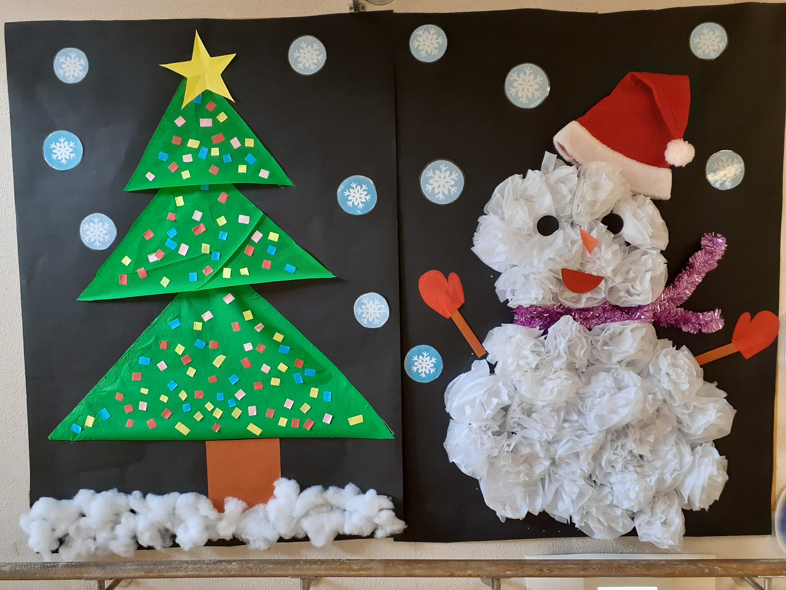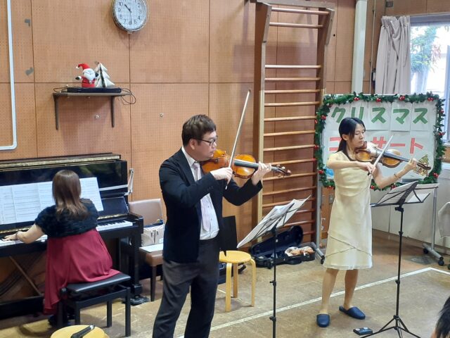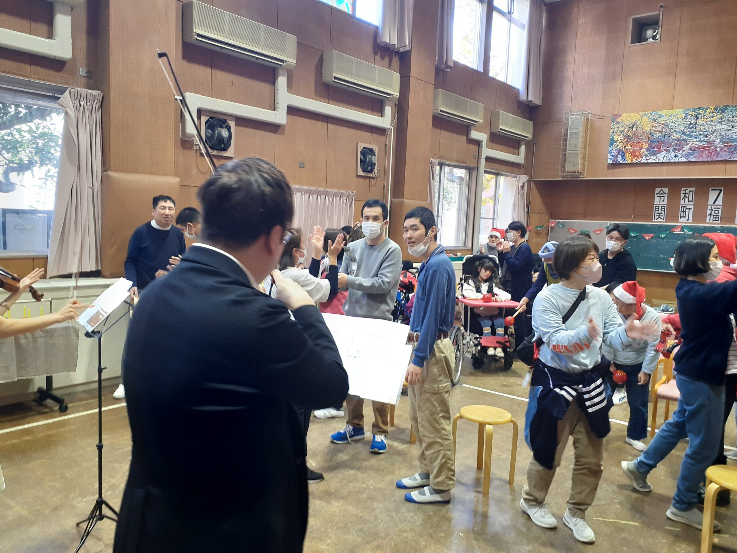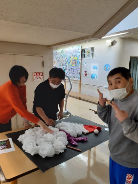 午前はプロの演奏家の方に来ていただきました。クラシックやアニメソング、クリスマスソング等の幅広い曲を演奏していただき大盛りあがり♪午後は【レクリエーション創作】として、くじ引きで引いた内容のパーツを画用紙に貼っていき、壁画完成させました。クリスマスの雰囲気を楽しむ1日中楽しむことができました。