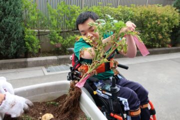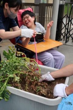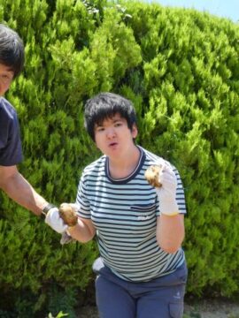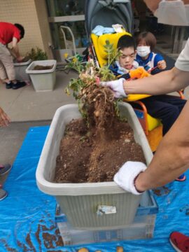 利用者の皆さんの歓声がこだまし笑顔がはじけ、楽しく収穫ができました。