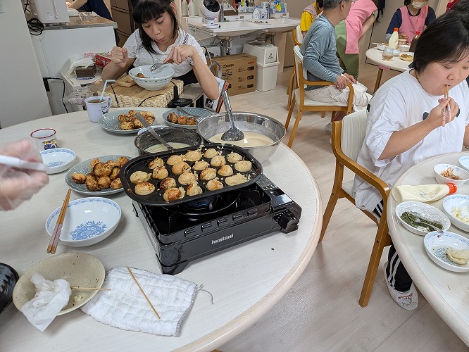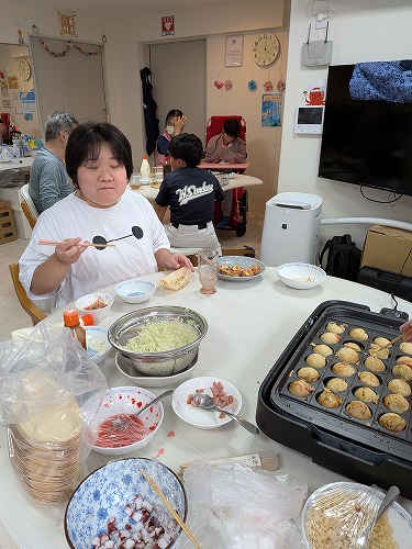 まぁる名物【たこ焼きパーティー】、たこ焼きは利用者のみなさんの大好物です。
